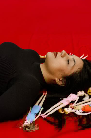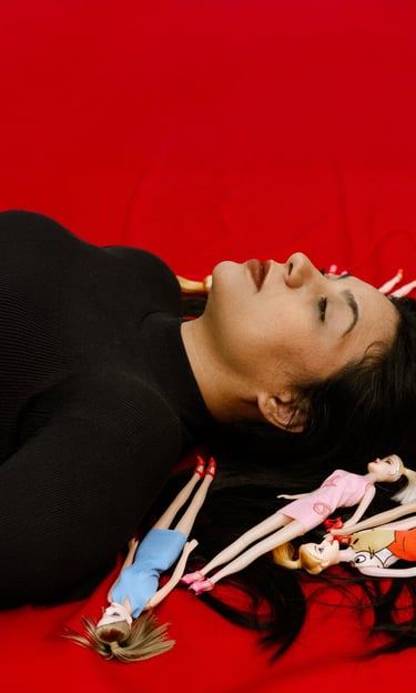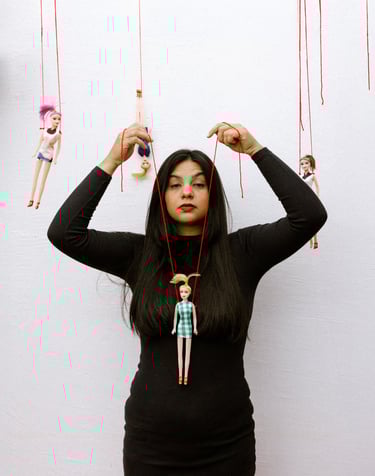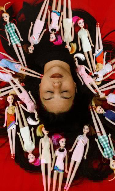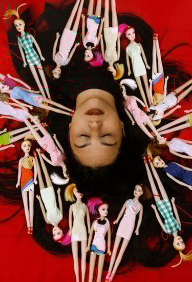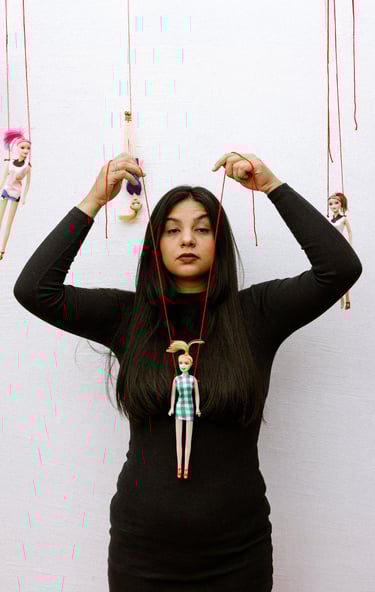 As bonecas surgem como signos dos papéis que nos pressionam a assumir, remetendo a um controle silencioso, mas também como elementos da infância que simbolizam a cura intergeracional.