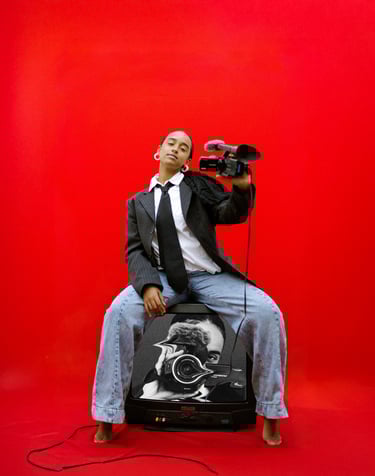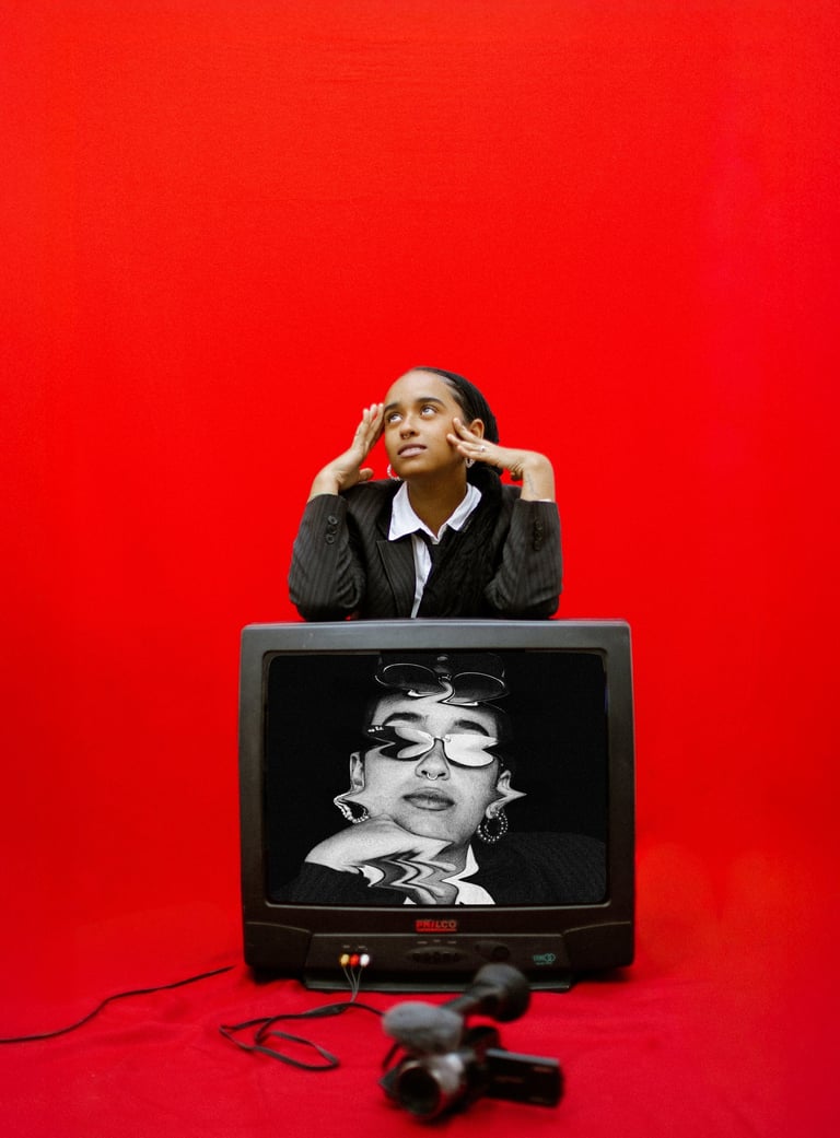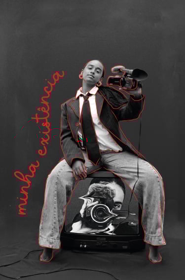Elementos como a TV de tubo e a câmera contextualizam o audiovisual, enquanto a imagem distorcida na tela remete aos ruídos e hostilidades enfrentados no meio artístico.